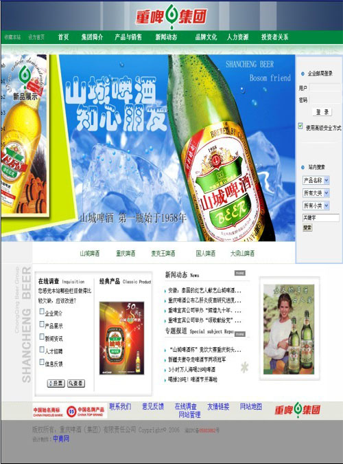 公司擁有“重慶”、“山城”、“國(guó)人”、“麥克王”、“大梁山”以及“天目湖”等品牌啤酒系列產(chǎn)品,以其口味純正、淡爽(醇厚)、包裝美觀大方、風(fēng)味保鮮穩(wěn)定、符合消費(fèi)時(shí)尚等特點(diǎn),在國(guó)內(nèi)具有很高的知名度。1999年,“重慶啤酒”榮登“慶祝建國(guó)50周年”和“澳門(mén)回歸”國(guó)宴用酒;2001年,重啤集團(tuán)的“重慶啤酒”、“山城啤酒”和“麥克王”啤酒等六個(gè)品牌又榮獲“中國(guó)優(yōu)質(zhì)新品啤酒”榮譽(yù)稱號(hào)!2002年,“重慶啤酒”又遠(yuǎn)銷香港、澳門(mén)和臺(tái)灣地區(qū)。2004年,“山城啤酒”被認(rèn)定為“中國(guó)馳名商標(biāo)”;2005年,“山城啤酒”榮獲“中國(guó)名牌”稱號(hào)。