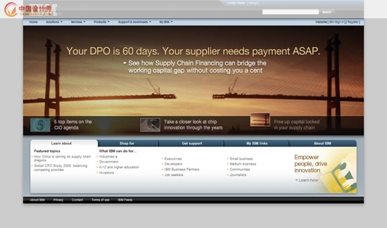 另外我們還可以看到IBM這次新的設計比原來的設計更有立體感,這就是我上面所說的元素層次。這種層次感拉開了瀏覽者的視覺深度,使得我們的網(wǎng)頁不再平面。雖然也不是3D的效果,但是我相信2D的效果必然會成為網(wǎng)頁設計的一個新的趨勢。通過2D模擬出視覺立體感,會使得網(wǎng)頁設計更有張力,內(nèi)容也更為豐富。