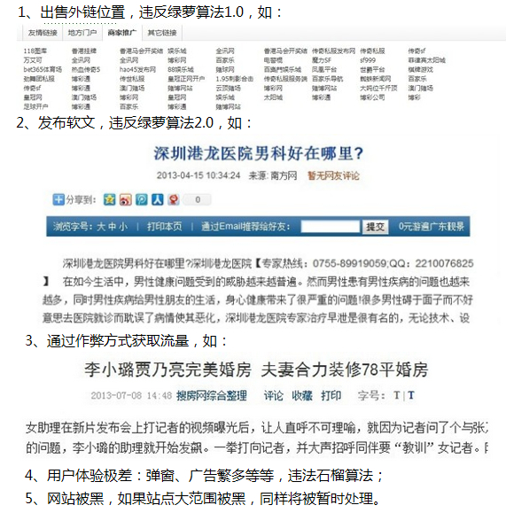 違反如下原則的站點將視嚴(yán)重程度受到不同程度的懲罰:降低搜索引擎系統(tǒng)評價、目錄或站點屏蔽清理出新聞源、整站屏蔽清理出新聞源。具體原則包括但不限于如下: