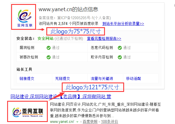 a.LOGO提交尺寸:PC/移動站可提交121*75、75*75、84*52三種尺寸的圖片。其中121*75尺寸的LOGO用于PC檢索時候展現在TITLE下方、75*75尺寸的LOGO用于使用SITE命令的時候展現、而84*52尺寸的LOGO則主要是自適應站、具有獨立移動站等網站在移動端展示的。